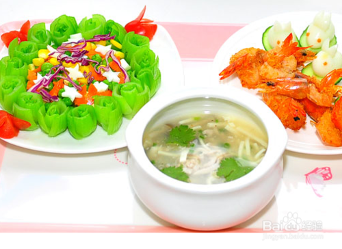 (3)土豆泥配蔬菜湯:土豆泥口感細(xì)膩,搭配各種蔬菜制成的湯,營養(yǎng)豐富。