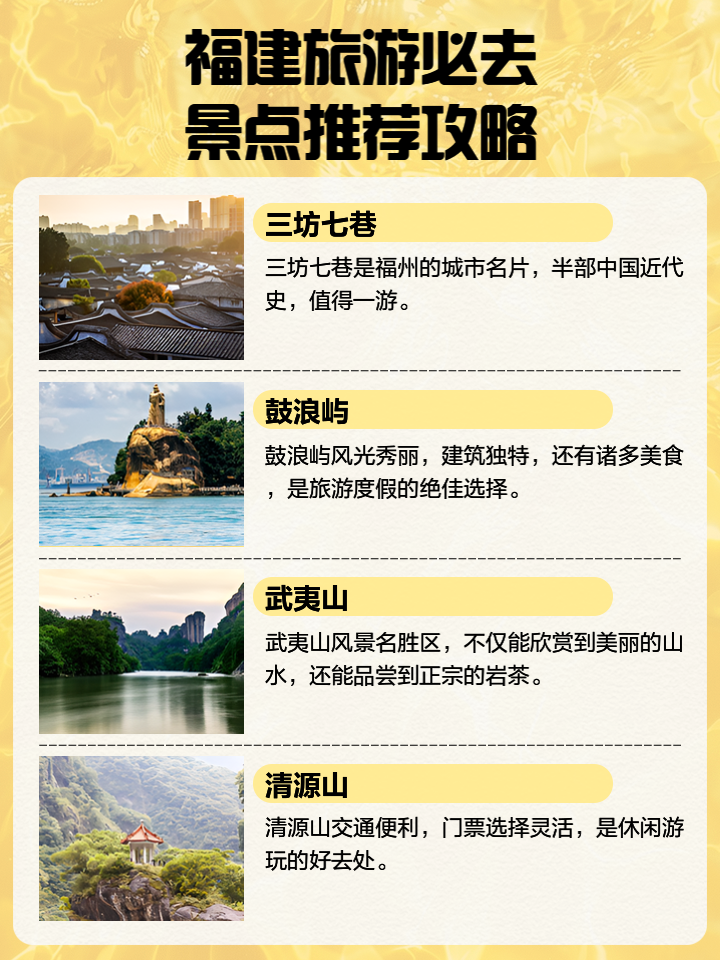 福建旅游攻略三日游是一次充滿(mǎn)魅力的旅程,無(wú)論你是喜歡自然風(fēng)光還是歷史文化,無(wú)論你是喜歡美食還是特色,福建都能滿(mǎn)足你的需求,希望這篇攻略能幫助你更好地規(guī)劃你的行程,讓你在福建的旅程中留下美好的回憶。